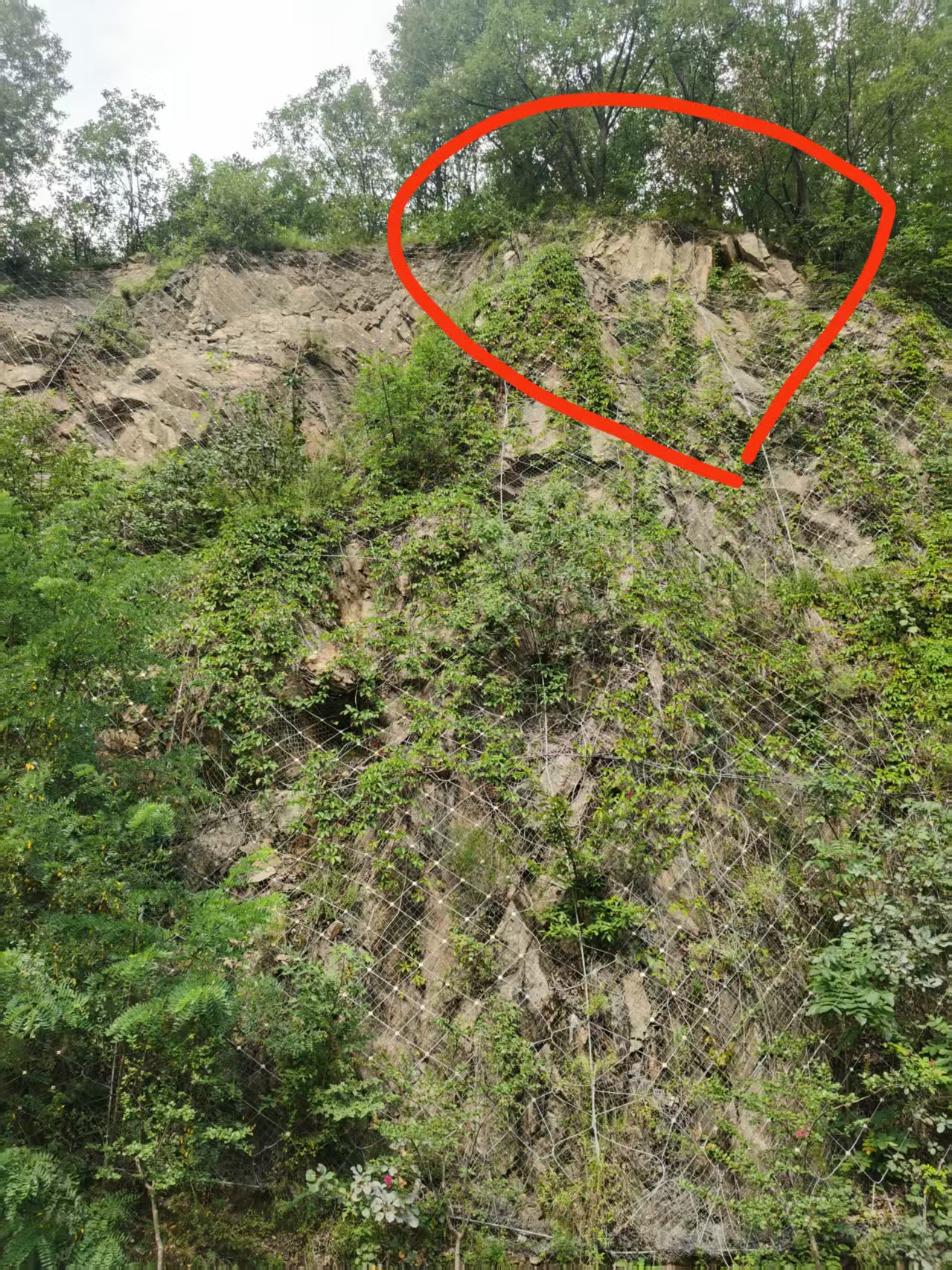 刘女士表示,事发后他们回到现场查看情况后认为,事发路段存在防护不到位情况。在距事故点约一两百米处,她看到有防护网破损的情况。她提供的一张照片显示,该处防护网内有石块被网兜住,防护网有一定变形。此外,她也表示,周边部分区域的防护网未完全覆盖到顶,有石块裸露。